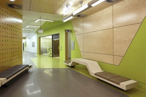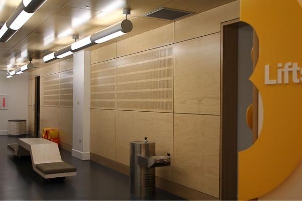 The hospital features an atrium style interior with plywood walls and ceilings featured throughout every floor. With a clear focus on families, the design incorporates the use of bright colours, space, eccentric shapes and has a huge focus on environmentally sustainable design principles, including reducing emissions. The coating used had to comply with QLD Government Building and Safety Regulations and meet the Green Building Council of Australia’s guidelines in regard to VOC emissions.