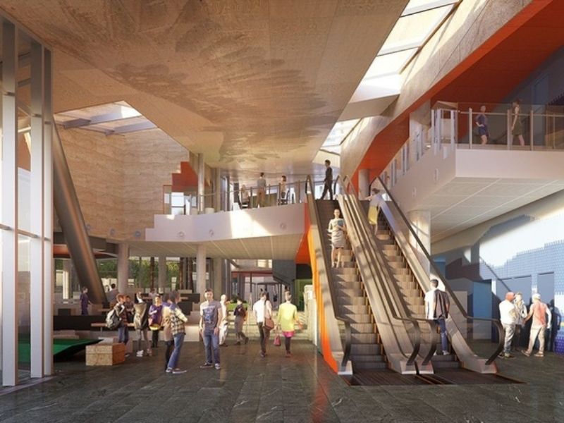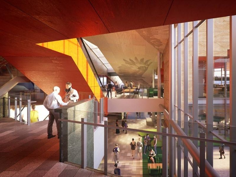 The urban facility provides a feeling of openness and accessibility to foster learning in a technology rich environment. The Birabahn (Eaglehawk) is a key protective Totem of the Awabakal people. The design located across level one and two through an interpretive pattern on the plywood ceiling was executed by The GDK Group a multi-disciplined manufacturer of acoustic panelling, timber wall and ceiling panels and customised design finishes.